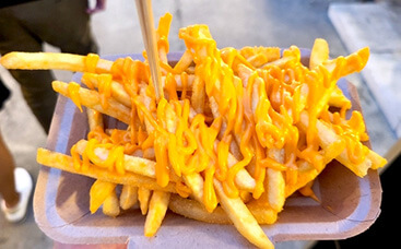 友人と人気の食べ歩きメニューにチャレンジ!